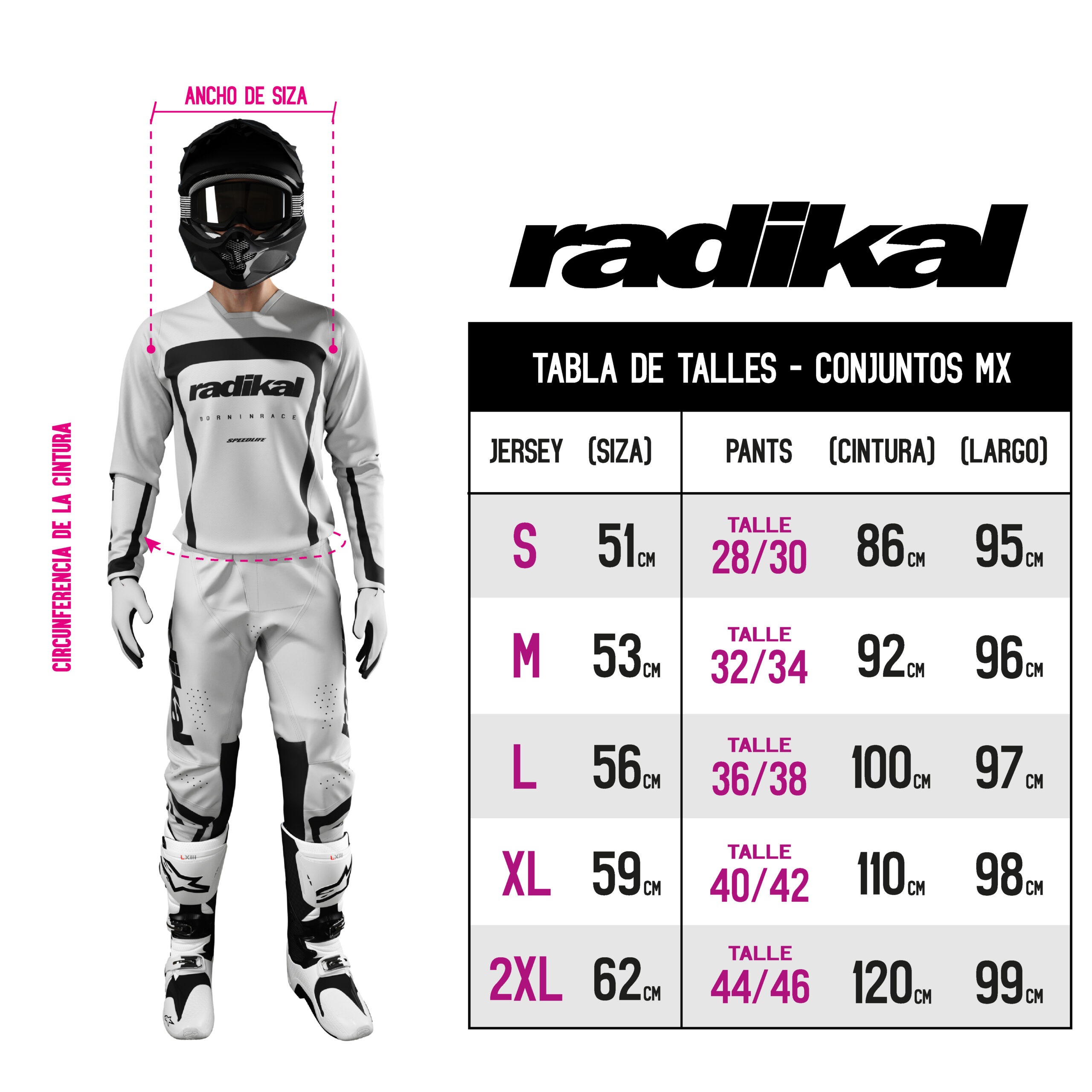 Talles: 28/30 S, 32/34 M , 36/38 L , 40/42 XL , 44/46 XXL .